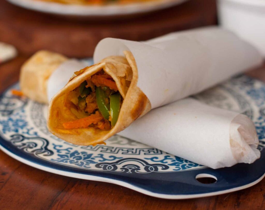 রান্না-প্যানে তেল গরম করে পেঁয়াজ, সবজি ও চিকেন হালকা ভেজে নিন। লবণ ও চাট মশলা দিন। পরোটার মাঝে ভরে রোল করে মুড়ে দিন।