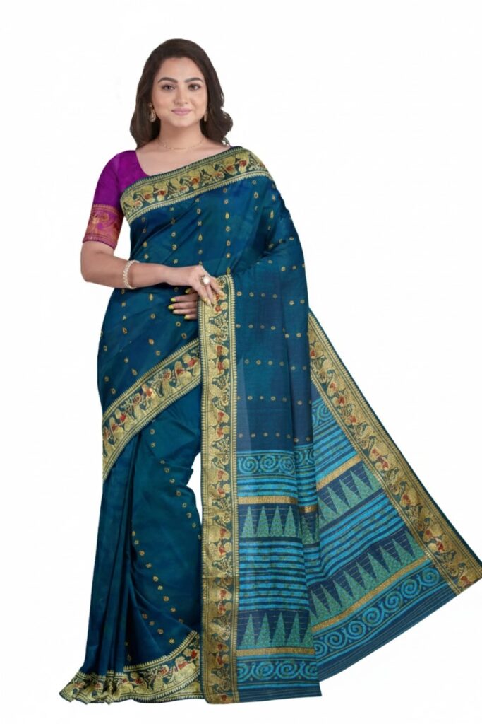 মাহেশ্বরী পিওর সিল্ক হ্যান্ড উভেন শাড়ি – মধ্যপ্রদেশের মাহেশ্বর শহরের নামানুসারেই মাহেশ্বরী খাঁটি সিল্ক হ্যান্ডলুম শাড়ির পরিচিতি। রানি অহল্যাবাই হোলকর-এর উদ্যোগে সৃষ্ট এই শাড়ি আজও ঐতিহ্য, সূক্ষ্ম বুনন ও রাজকীয় সৌন্দর্যের প্রতীক। হালকা ও মসৃণ সিল্ক, জ্যামিতিক বর্ডার ও নরম রঙের সমন্বয়ে মাহেশ্বরী শাড়ি আধুনিকতার সঙ্গে বহন করে শতাব্দীপ্রাচীন শিল্পঐতিহ্য।মুল্য -১৩৭৯৭। ডিসকাউন্টের পর -১১০৩৮ ।