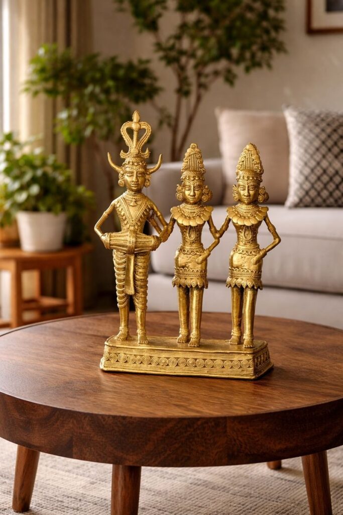 সাঁওতাল পরিবার ডোকরা – মধ্যপ্রদেশের ডোকরা শিল্প আদিবাসী শিল্পচর্চার এক প্রাচীন ও মূল্যবান ধারা, যেখানে মাটি সহ ৫রকম ধাতুর মিলনে জন্ম নেয় অনন্য শিল্পকর্ম। সাঁওতাল পরিবারের এই ডোকরা শিল্পকলায় ফুটে ওঠেছে লোকজ বিশ্বাস, প্রকৃতির ছোঁয়া ও প্রজন্মান্তরের কারুশিল্প যা স্বতন্ত্র এবং প্রাণবন্ত।মূল্য – ৯০৭২ টাকা।