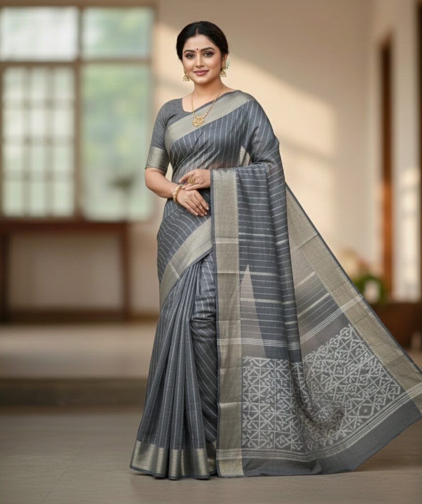 কোসা সিল্ক তসর – মধ্যপ্রদেশের ঐতিহ্যবাহী কোসা তসর সিল্কে শ্রিভোরি কাজের শাড়ি মানেই প্রাকৃতিক সৌন্দর্য ও লোকশিল্পের এক অনন্য প্রকাশ।ঘন ও মসৃণ তসর বুননের উপর সূক্ষ্ম শ্রিভোরি নকশা শাড়িটিকে করে তোলে আরও রাজকীয় ও আকর্ষণীয়।প্রতিটি শাড়িতে ধরা থাকে আদিবাসী কারিগরদের শতাব্দীপ্রাচীন শিল্পধারা ও নিখুঁত হাতে গড়া ঐতিহ্য।উৎসব, বিবাহ বা বিশেষ দিনের সাজে কোসা তসর শাড়ি এনে দেয় মাটির গন্ধ মেশানো আভিজাত্য।দাম -১৩১৩৫ টাকা, ডিসকাউন্টের পর – ১০৫০৮ টাকা।